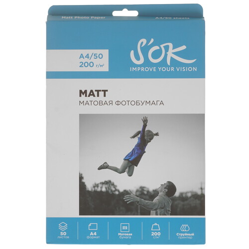 Фотобумага S'OK SA4200050M предназначена для струйной печати с поддержкой разрешения 5760 dpi. В пачке упаковано 50 листов формата A4. Это позволяет на каждом из носителей распечатать большое изображение для рамки или сразу 4 фотографии привычных размеров 10x15 см для вставки в фотоальбом.