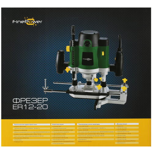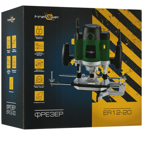 Фрезер FinePower ER12-20 оборудован 2-киловаттным двигателем щеточного типа, отличающимся простотой обслуживания. Набор запасных щеток есть в комплекте. Необходимое качество фрезерования помогает обеспечивать функция поддержания постоянных оборотов под нагрузкой. Значительно сократить количество стружки и других отходов в рабочей зоне вы сможете, воспользовавшись подключением фрезера к пылесосу. В устройстве реализована система плавного пуска, минимизирующая нагрузку на сеть и продлевающая ресурс мотора. Фрезер не является громоздким. Устройство, имеющее размеры 295x365x377 мм, несложно разместить даже в мини-мастерской.