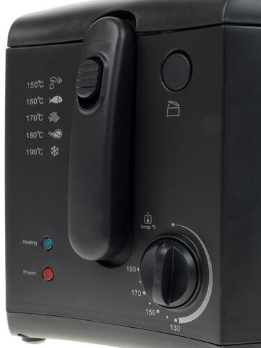 В чашу Clatronic FR 3649 schwarz вмещается 2.5 л масла, на передней панели есть светодиодные индикаторы, которые показывают, когда прибор включен в сеть и идет нагрев.