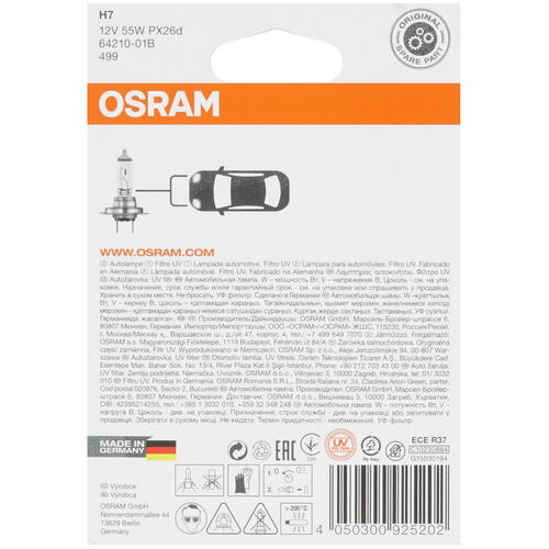 Галогенная лампа OSRAM Original 64210-01B используется в головном свете. Тип цоколя – H7. Лампы этого вида являются одними из самых востребованных: они устанавливаются в фары ближнего и дальнего света, а также в противотуманные фары.