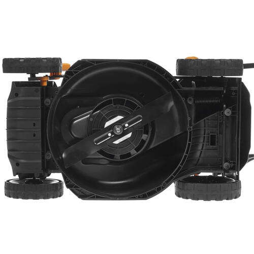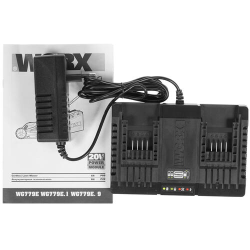 Аккумуляторная газонокосилка Worx WG779E с 4 пластиковыми колесиками является несамоходной, поэтому оператор самостоятельно перемещает ее по обслуживаемой территории при помощи рукоятки. Рукоятка управления может быть как отрегулирована по высоте, так и сложена, чтобы косилка занимала меньше места при хранении и перевозке. Два аккумулятора (20 В, 2,5 Ач,), документация, зарядное устройство предлагаются вам вместе с этой моделью.