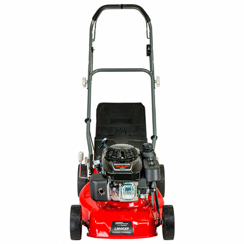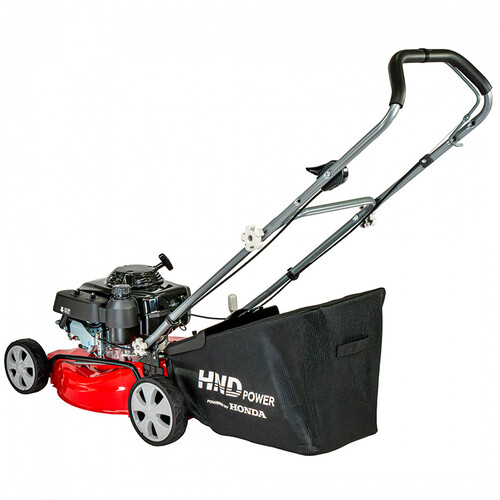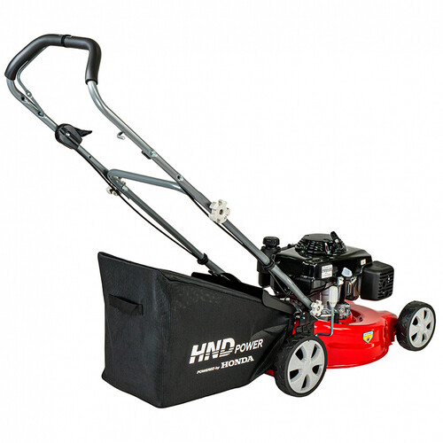 Бензиновая газонокосилка HND LM 46 XP с шириной кошения 46 см. Газонокосилку LM 46 XP предназначена для скашивая ровного газона рядом с загородным домом. Она идеально сочетает в себе замечательную маневренность и высокую скорость кошения газона. Скошенная трава собирается в тканевый травосборник объемом 55 литров. В качестве силового агрегата в газонокосилке HND LM 46 XP установлен оригинальный четырехтактный очень надежный бензиновый мотор HONDA мощностью 4.3 лс (соответствует 3.2 кВт). Качественный и прочный острый режущий нож сделан из прочной стали, он долго остается острым. При кошении острый нож не бьет, а аккуратно срезает траву, и газон после стрижки не желтеет, а остается изумрудно - зеленым. Высокую проходимость самоходной газонокосилке HND LM 46 XP обеспечивают большие колеса 175 и 200 мм установленные на шарикоподшипниках. Газонокосилка HND LM 46 XP без привода на колеса, движение производится толканием, и для эксплуатации техники лучше выбирать газон без уклонов.
