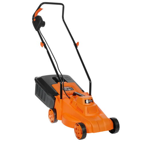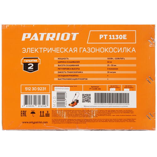Электрическая газонокосилка Patriot PT 1130E обладает мощностью 1300 Вт, что соответствует 1.7 л.с., и представляет собой очень удобный инструмент для сезонного ухода за газоном. Такая мощность двигателя позволяет вращать ножи со скоростью 3450 об/мин, что позволяет быстро избавляться от травы. Выброс травы осуществляется в травосборник. Этот контейнер изготовлен из пластика и обладает объемом 30 л.