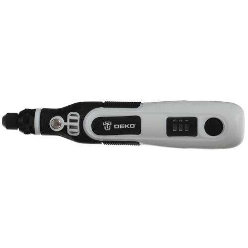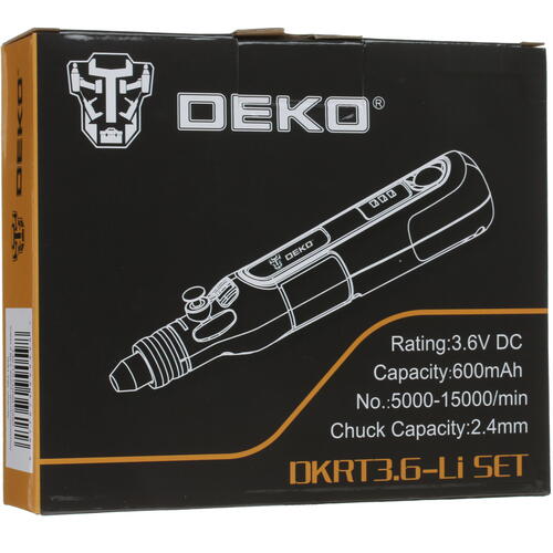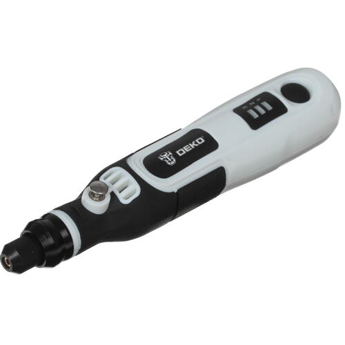 Для высокой точности настройки в зависимости от типа материала DEKO DKRT3.6-Li SET 063-1400 поддерживает регулировку числа оборотов от 5000 до 15000 об/мин. Эргономичная конструкция рукоятки обеспечивает комфортный захват инструмента. Гравер поставляется вместе с насадками для зачистки, гравирования, полировки, резки и шлифования материалов. Они помещены в пластиковый кейс. Всего в комплекте предусмотрено 24 предмета.