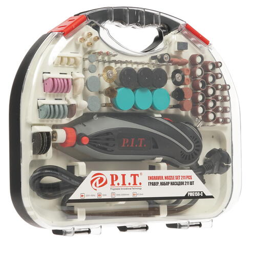 Машина гравировальная PIT PMG150-С МАСТЕР предназначена для шлифования, фрезерования, гравирования, полирования, сверления и резки различных материалов. При помощи регулятора оборотов можно настраивать интенсивность вращения оснастки в зависимости от материала. Максимальное количество оборотов составляет в пределах 33000 за минуту. Для быстрой и простой смены оснастки предусмотрена фиксация шпинделя. В комплекте с PIT PMG150-С МАСТЕР поставляется широкий набор сменных насадок – всего 211 предметов. Для хранения и транспортировки предлагается практичный пластиковый кейс.
