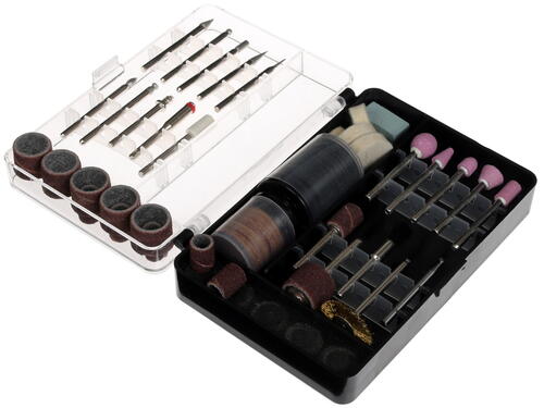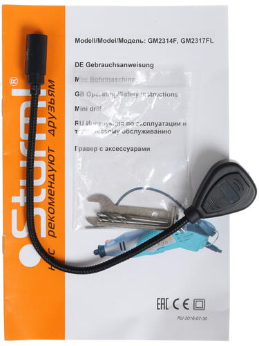 В комплекте с гравером Sturm! GM2317FL, снабженным гибким валом для успешной работы в труднодоступных местах, умельцу предлагается в общей сложности 120 аксессуаров. Инструмент, получающий питание от сети 220 В, может использовать в декоративном творчестве или техническом конструировании как мастер-самоучка, так и опытный специалист. Насадки для гравера расположены в отдельном полупрозрачном кейсе, а сам инструмент вместе с принадлежностями размещен в мягкой сумке для переноски.