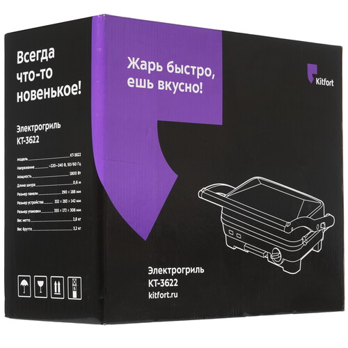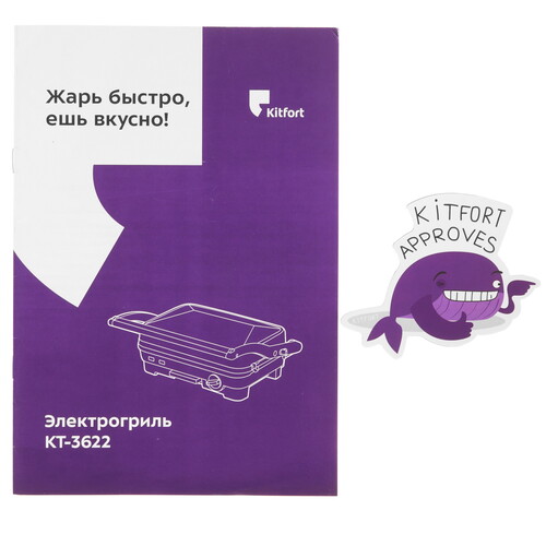 Верхняя крышка откидывается на 180° и превращает гриль в жаровню. Это позволяет обжаривать продукты на каждой панели по отдельности. С помощью поворотного регулятора плавно настраивается степень нагрева. Встроенный термостат поддерживает заданный температурный режим. Для сбора сока и жира в процессе приготовления есть поддон. В наборе с грилем Kitfort КТ-3622 предусмотрена лопатка для удаления пригоревшей пищи и жира с панелей.