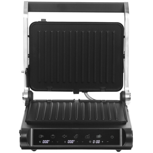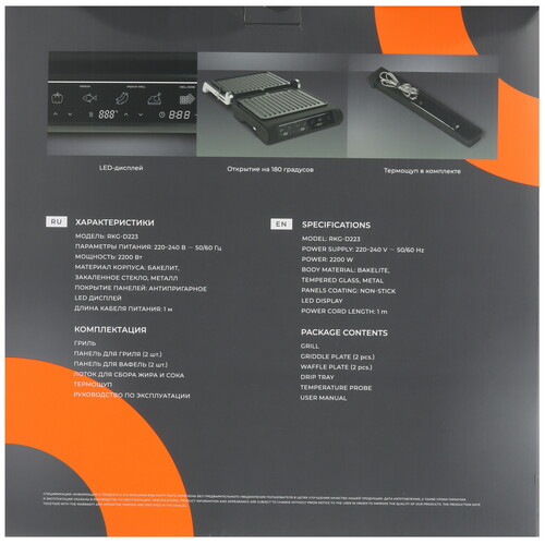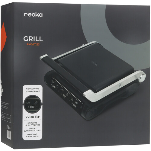 В гриле Reoka RKG-D223 реализованы 6 автоматических программ: «Овощи», «Мясо», «Рыба», «Сосиски», «Курица», «Вафли». Сенсорная панель с дисплеем делает простым выбор параметров при помощи касаний. Разноцветная шкала Color Mix отображает уровень нагрева и этапы приготовления. Открытие крышки на 180° предусматривает приготовление в режиме барбекю. После завершения программы гриль автоматически отключается. Это предотвращает пересушивание и сгорание блюд, а также защищает технику от перегрева.