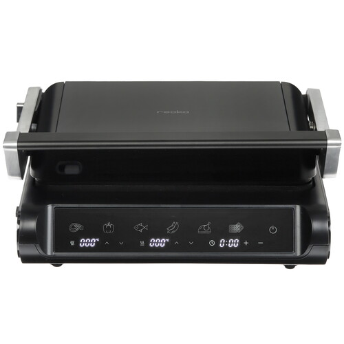 Гриль Reoka RKG-D223 оснащен двумя комплектами съемных нагревательных панелей размером 33.4х23.8 см: для жарки продуктов и венских вафель. Благодаря антипригарному покрытию не требуется добавления масла и упрощается очистка. В модели реализована автоматическая настройка степени прожарки. Температура нагрева каждой панели регулируется независимо друг от друга в диапазоне от 90 °C до 230 °C. Это позволяет готовить стейки и другие продукты с разной степенью прожарки. Функция пресса на основе прижимной пластины предусматривает изменение давления верхней пластины.