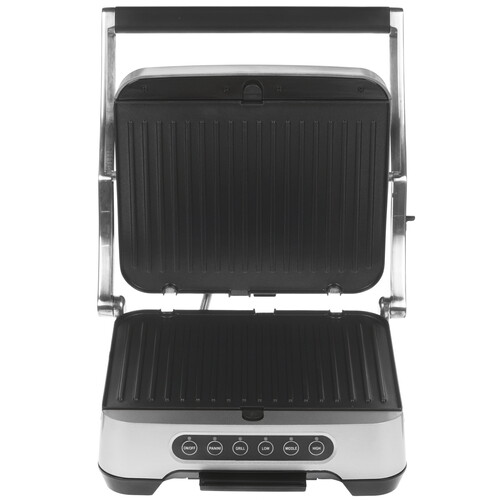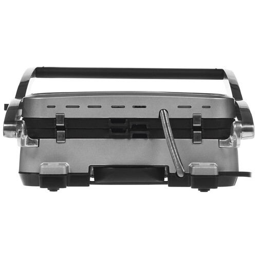 Гриль выполнен в металлическом корпусе и оборудован электронной панелью управления со светодиодной индикацией. Верхняя панель предусматривает фиксацию в 2-х положениях. Конструкция прибора предлагает раскрытие на 105 и 180 градусов (режим барбекю). Лоток для сбора жира и сока легко очищается при необходимости. Для безопасной эксплуатации гриль Scarlett SC-EG350E04 оборудован ручкой с покрытием COOL TOUCH и прорезиненными ножками на основании.