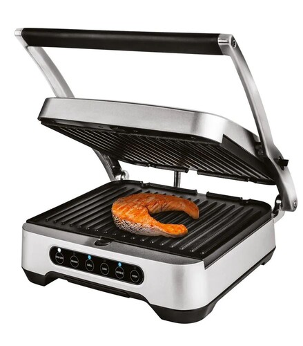 Гриль Scarlett SC-EG350E04 серебристый мощностью 2200 Вт позволит вам готовить вкусные блюда из самых разных продуктов. Он оснащается двумя съемными комбинированными панелями 29x23 см с долговечным антипригарным покрытием. Использование гладкой поверхности оптимально подходит для приготовления бутербродов или яичницы, а рифленая поверхность обеспечивает равномерную прожарку мяса и рыбы.