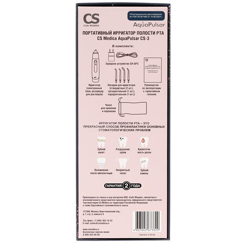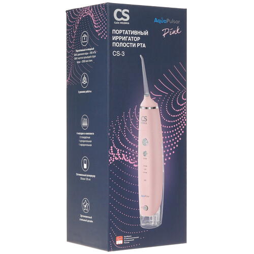 CS Medica AquaPulsar CS-3 оснащен резервуаром для воды емкостью 130 мл. В комплекте поставляются 2 стандартные насадки, насадка для брекетов, а также пародонтальная насадка. В качестве источника автономной работы применяется аккумулятор. В наборе дополнительно предусмотрены крепления на стену, адаптер зарядки и чехол.