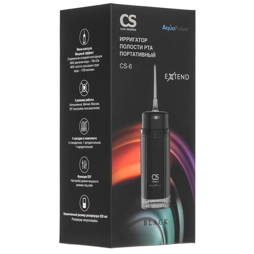 Прибор оснащен резервуаром вместимостью 0.2 л. Для удобной процедуры очистки есть таймер с автоотключением через 2 минуты, поэтому не нужно засекать время. В комплекте поставляются 4 сменные насадки. Они вращаются на 360° и обеспечивают гигиеничную чистоту ротовой полости. Аккумулятор гарантирует до 10 дней автономной работы. Ирригатор CS Medica AquaPulsar CS-6 Extend выполнен в черном корпусе.