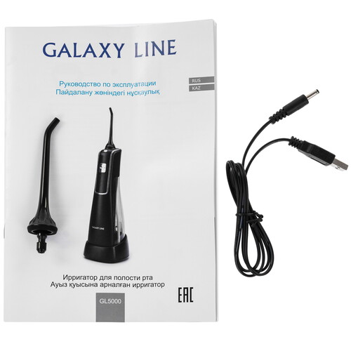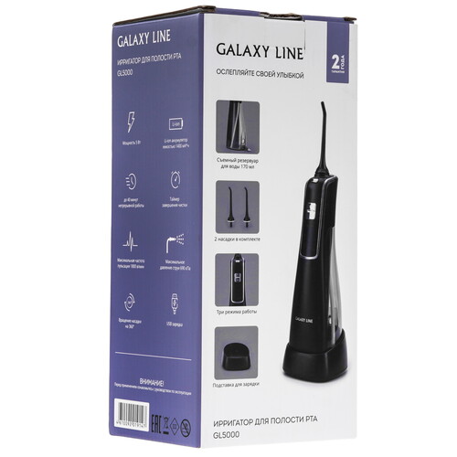 Ирригатор GALAXY LINE GL5000 ‒ беспроводная модель с Li-ion-аккумулятором емкостью 1400 мА·ч. Его ресурса хватает на 40 минут при ежедневном пользовании. Он использует съемный бак объемом 170 мл, а также помпу и батарею встроенные в ручку. Прибор с 2 стандартными насадками обеспечивает полную очистку полости рта. Благодаря маркерным пометкам каждый член семьи сможет определить свою насадку.