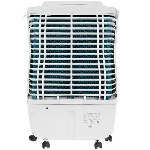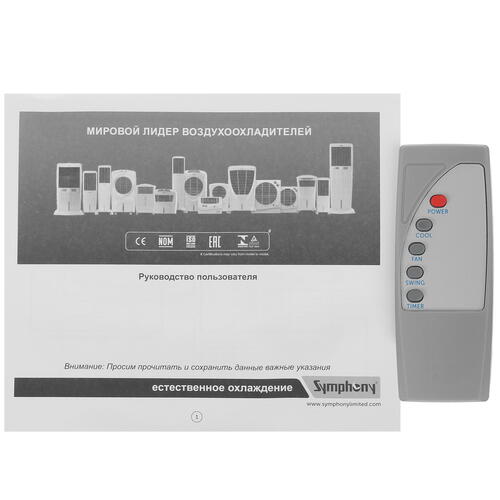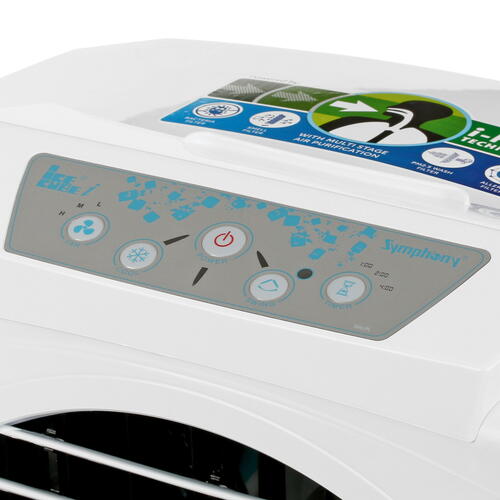 Управление прибором возможно при помощи панели с кнопками и пульта ДУ. Внутри корпуса установлены противомоскитный и пылеулавливающий фильтры. На основании корпуса имеются маневренные колеса, позволяющие легко перемещать охладитель Symphony Ice Cube 17i.