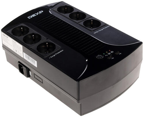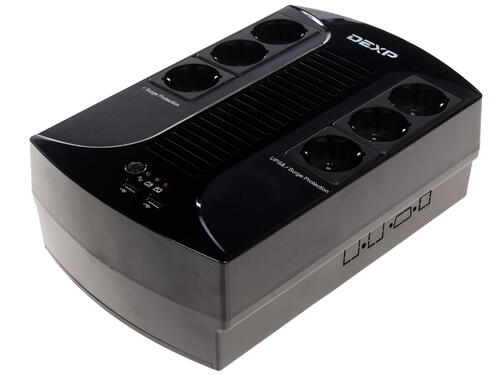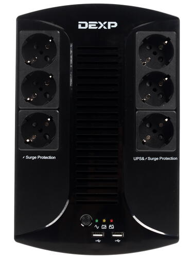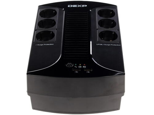ИБП DEXP HOME 850VA – модель, которая при обнаружении перебоев в напряжении автоматически в течение 10 мс совершает переход подсоединенных к ней устройств на дополнительное питание от бесперебойного источника. Светодиодные индикаторы, находящиеся на лицевой части модели, отображают информацию о состоянии источника бесперебойного питания. Там же расположены: два USB-порта и шесть евророзеток, которые защищают от скачков напряжения. Три из шести розеток осуществляют бесперебойное питание подключенных устройств.