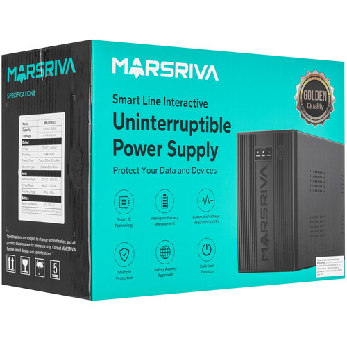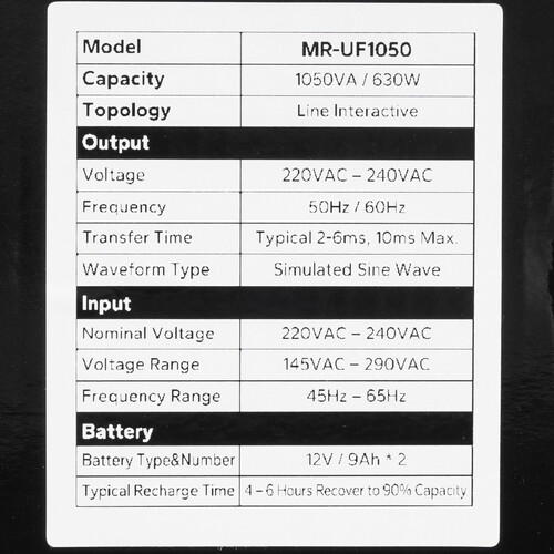 Линейно-интерактивный ИБП MARSRIVA MR-UF1050 обеспечивает эффективную выходную мощность 600 Вт. Для подключения нагрузки используются 2 евророзетки. ИБП рассчитан на эксплуатацию при положительных температурах до 40 °C.