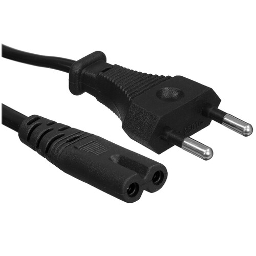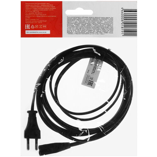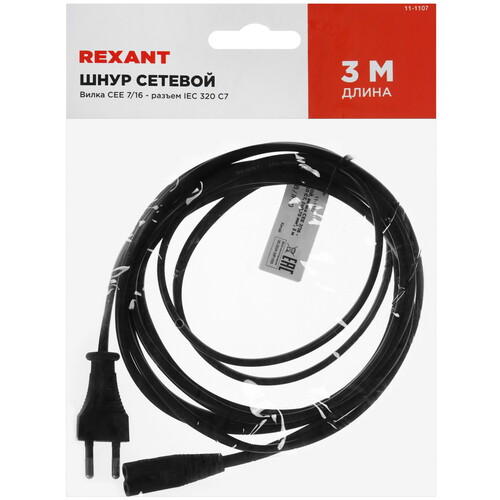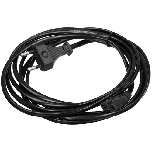 Шнур сетевой 3 М 2x0.75мм² REXANT предназначен для подключения к сети переменного тока (AC) с напряжением 220B аудио-, видеоаппаратуры, источников питания ноутбуков, игровых консолей и других приборов, имеющих штыревой сетевой разъем типа С8 (известен из-за его формы как "восьмёрка"). Данный сетевой шнур (IEC cord) оснащен с одной стороны литой неразборной плоской вилкой (Евро), с другой литым гнездовым неполяризованным разъёмом типа C7 (евро-разъём) и двухжильным проводом с сечением жил 0.75мм².