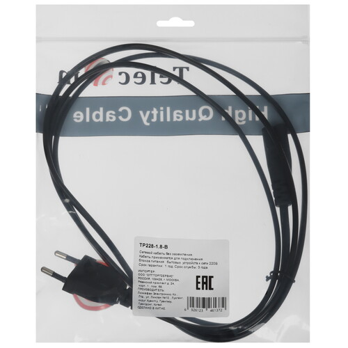Кабель питания Telecom имеет длину, составляющую 1.8 м. Как правило, такая длина кабеля достаточна для комфортного размещения оборудования. Цвет изделия – черный. Кабель питания рассчитан на длительный срок эксплуатации.