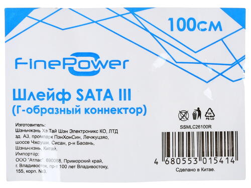 Шлейф FinePower SATA - SATA имеет внушительную длину, равную одному метру. Благодаря такой длине вы сможете соединить друг с другом два комплектующих элемента компьютера, располагающиеся по разным углам системного блока. Один из коннекторов имеет Г-образную форму и оборудован защелкой для максимально надежной фиксации в соответствующем разъеме подключаемого устройства. Спецификация представленного шлейфа соответствует SATA-3. Оба разъема кабеля имеют конструкцию Male-вида. Использование передовых технологий в процессе изготовления шлейфа обеспечили его бесперебойным и долгосрочным функционированием.