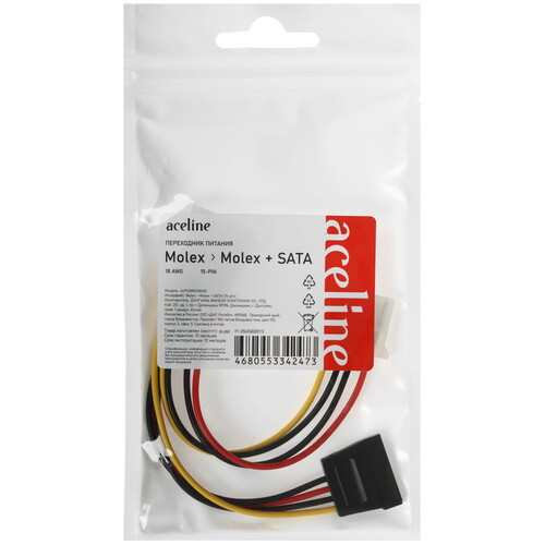 Универсальный переходник для питания Aceline Molex - Molex + SATA в виде разветвителя используется для питания SATA HDD, SSD и оптических приводов. Длина изделия – 15 см.