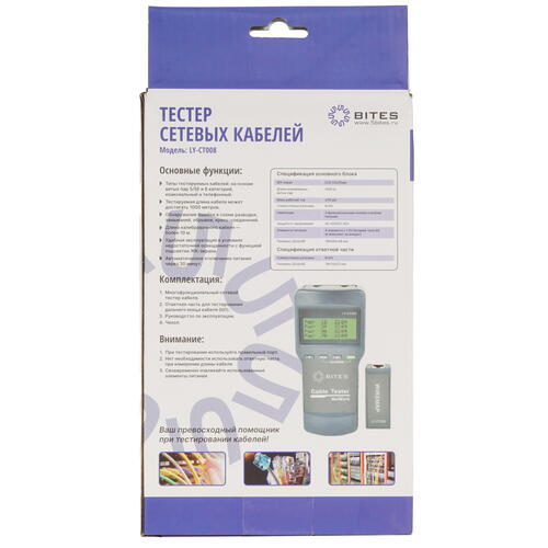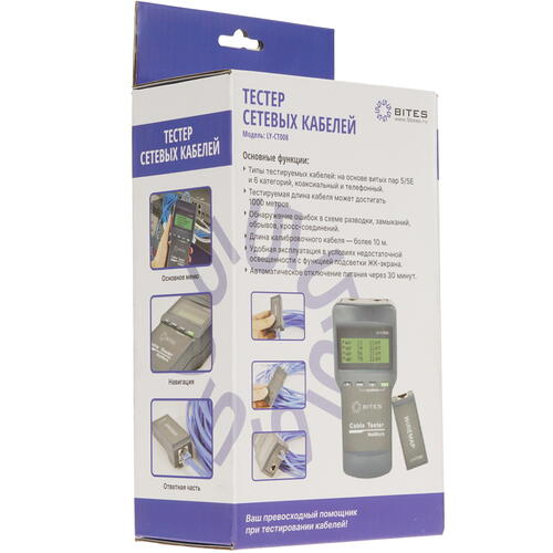 Кабельный тестер 5bites LY-CT008 состоит из двух блоков, которые позволяют определять правильность обжима, наличие обрыва и короткого замыкания, целостность соединения на расстоянии до 1000 м. Он подходит для проверки неполадок в телефонных, коаксикальных и соединительных кабелях с коннекторами подключения RJ-11, RJ-12, RJ-45. Для удобного контроля сведений в процессе тестирования установлен дисплей. Автономная работа устройства выполняется от батареек AA. Кабельный тестер 5bites LY-CT008 поставляется в комплекте с чехлом для безопасного и удобного хранения.