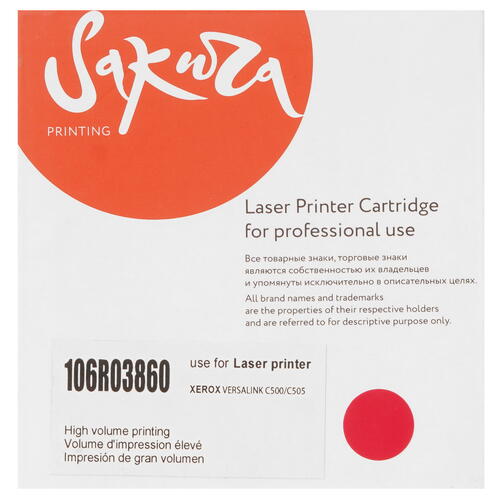 Тонер-картридж SAKURA 106R03860 имеет вид пластикового контейнера с двумя резервуарами. В одном хранится тонер пурпурного цвета, а в другом накапливается отработанный порошок. Картридж разработан для лазерных принтеров Xerox и устанавливается в устройство вместе с компонентами других цветов. При смешивании голубого, пурпурного, желтого и черного порошка устройство получает необходимые оттенки.