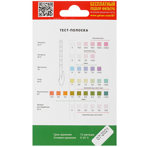 Тщательно следите за качеством употребляемой жидкости? Тогда вам точно пригодится Экспресс-тест Гейзер 8 показателей. В комплект входят пробирки для воды и специальная полоска с индикаторами, а также подробная инструкция с описанием полученных значений.