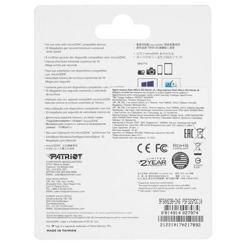 Карта памяти Patriot LX обладает объемом 32 ГБ и подходит для использования в различных мобильных устройствах за счет популярного форм-фактора microSDHC. Class 10 и UHS Class 1 обеспечивают высокие показатели скорости записи и чтения данных: 10 Мбайт/сек и 80 Мбайт/сек соответственно. Это позволит использовать карту памяти Patriot LX в профессиональных фотокамерах, требующих от накопителей данных высокой производительности. Эксплуатация модели возможна при температуре в диапазоне от -25 до +85 градусов.