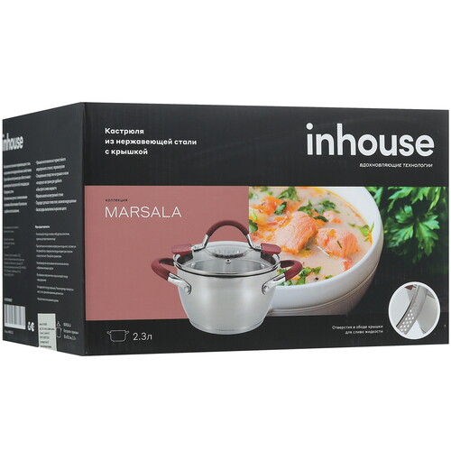 Inhouse Marsala подходит для готовки на индукционных и других типах плит, ручной и мойки в ПММ. Рукоятки из устойчивого к нагреву бакелита дополнены нескользящим и простым в уходе покрытием Soft Touch. Крышка из термостойкого стекла оснащена центральной круглой ручкой и силиконовыми прихватками, отверстием для выпуска пара.