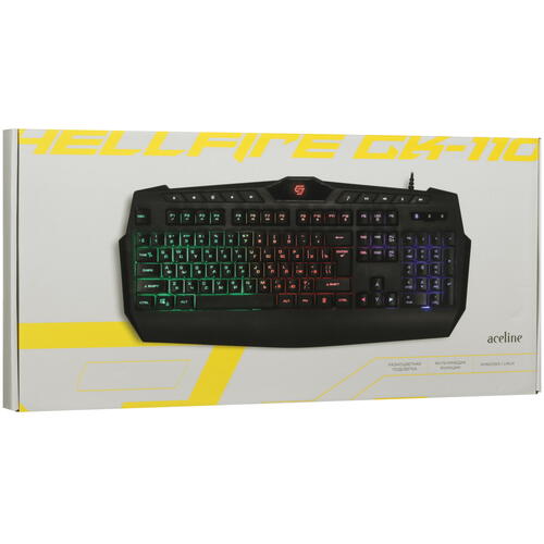 Подсветка Rainbow позволяет работать даже в условиях недостаточной освещенности, а подставка под запястье обеспечивает комфорт при наборе текста. Aceline GS Hellfire GK-110 подключается к компьютеру через USB-кабель длиной 1.7 м. Пластиковый корпус клавиатуры защищен от брызг на случай проливания кофе или воды.