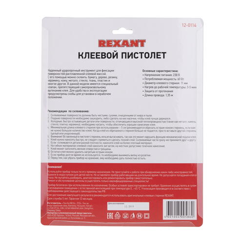 Клеевой пистолет REXANT 12-0114 включается с помощью надежного переключателя, расположенного на рукоятке. Рядом с переключателем расположен индикатор питания. Конструкцией пистолета предусмотрена скоба-подставка. Модель рассчитана на использование клеевых стержней с диаметром 11 мм и длиной, которая может достигать 150 мм. Комфортности эксплуатации инструмента способствует защита от капель. Масса клеевого пистолета составляет 350 г.