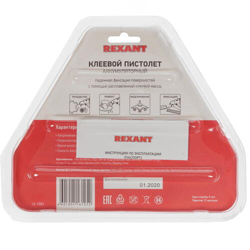 Для удобства в использовании клеевой пистолет оснащен эргономичной рукояткой и скобой-подставкой. Питание Rexant 12-1501 осуществляется на основе аккумулятора. В комплекте поставляются зарядное устройство, кабель USB, а также 2 клеевых стержня.