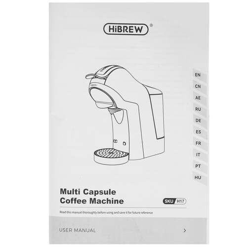 В модели реализованы функции регулировки крепости, температуры и порции напитка. Прозрачный резервуар для воды вмещает 1 л. На поддоне с регулировкой высоты помещается чашка высотой до 11.5 см. Сенсорная панель обеспечивает интуитивное управление кофемашиной Hibrew H17.