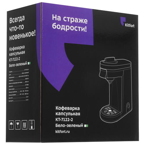 Кофемашина капсульная Kitfort КТ-7122-2 мощностью 800 Вт оборудована кнопочной панелью управления. Индикатор сигнализирует о готовности устройства приступить к работе. Модель справляется с приготовлением не только кофе, но также чая и какао.