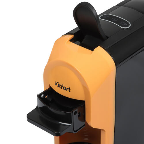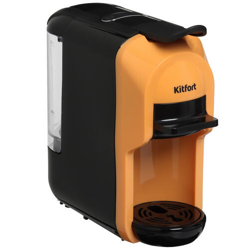 Кофемашина капсульная Kitfort КТ-7404 в пластиковом корпусе оранжевого цвета имеет резервуар для воды объемом 0.6 л. Для приготовления кофе используются капсулы Dolce Gusto и Nespresso Original. При отсутствии действий со стороны пользователя на протяжении 15 мин срабатывает технология автоматического отключения.