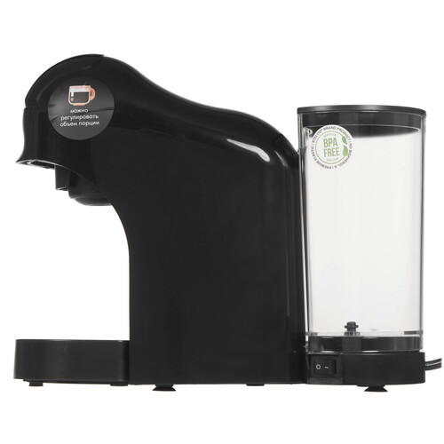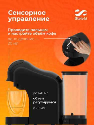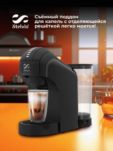 Кофемашина Stelvio Napoli XC100 B представлена в корпусе черного цвета. Резиновые ножки-присоски не царапают поверхность и прочно удерживают технику на столе. Бак для холодной воды имеет объем 0.75 л и изготовлен из пластика без содержания бисфенола А. Он не выделяет вредных веществ. Объем напитка настраивается касанием сенсорной панели в пределах от 20 мл до 140 мл. Съемные поддон для сбора капель и решетка обеспечивают удобную очистку от загрязнений. Энергосберегающая программа автоматически переводит кофемашину в режим ожидания после 5 минут простоя, защищает от перегрева и экономит расход электроэнергии. В наборе поставляются адаптеры для капсул и молотого кофе, ложка-темпер.