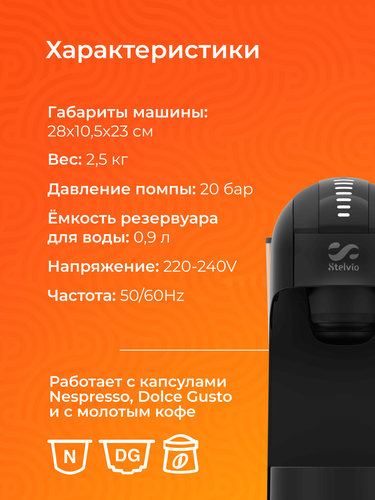 Кофемашина капсульная Stelvio Napoli XC100 B готовит напитки с использованием капсул формата Nespresso и Dolce Gusto, а также молотого кофе. С ее помощью можно делать эспрессо, капучино, латте, американо, горячий шоколад. Помпа с давлением 20 Бар гарантирует оптимальную экстракцию, максимально раскрывает вкус и аромат.
