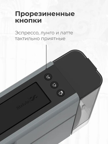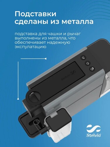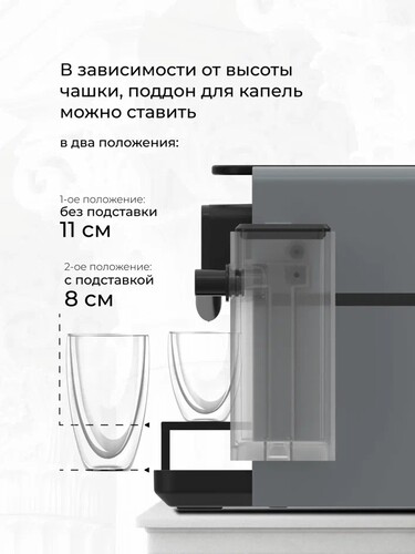В кофемашине Stelvio NC300 G применяются 3 кнопки выбора напитка и регулировки порции. Прозрачный резервуар для воды объемом 0.75 л выполнен из пластика. Он не содержит бисфенол А и не выделяет вредных веществ. Конструкция металлического поддона предусматривает фиксацию в двух положениях и адаптируется под размер чашки: 8 см с подставкой и 11 см без подставки. Съемные детали делают удобным процесс очистки и обслуживания. При бездействии в течение 5 минут кофемашина переводится в режим ожидания. Это гарантирует экономию энергопотребления и защищает от перегрева.