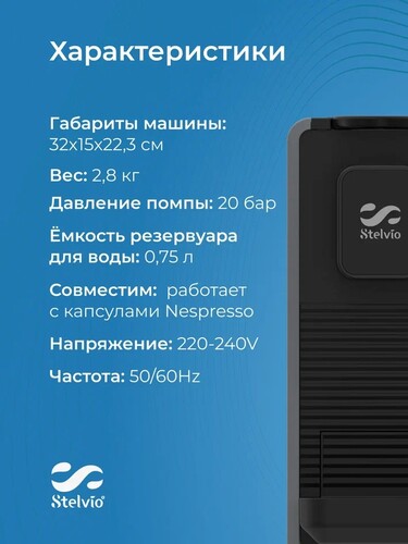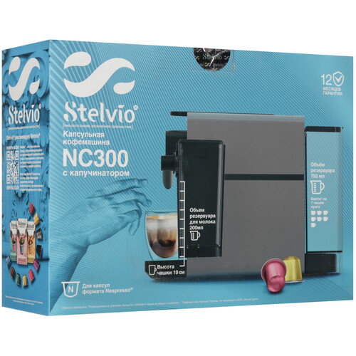 Кофемашина капсульная Stelvio NC300 G работает с капсулами формата Nespresso Original. С ее помощью можно готовить эспрессо, латте, капучино, ристретто, лунго, горячий шоколад. Помпа с давлением 20 Бар в полной мере раскрывает вкус и аромат, обеспечивает плотную кремовую пенку. Благодаря нагревательному элементу мощностью 1400 Вт процесс приготовления эспрессо с порцией 40 мл занимает 20 секунд. Автоматический капучинатор формирует воздушную пенку из молока и подает ее в чашку.