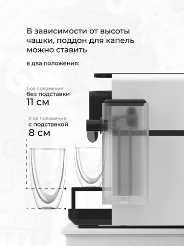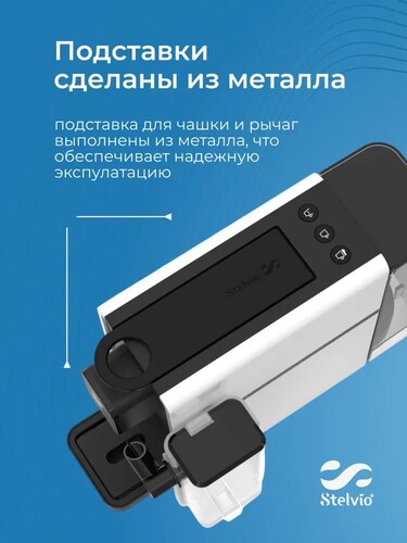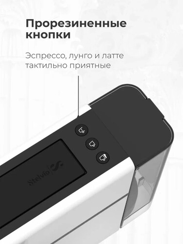 Кофемашина Stelvio NC300 W представлена в корпусе белого цвета. Резервуар для воды объемом 0.75 л выполнен из прозрачного пластика. Он не содержит бисфенол А и не выделяет вредных веществ. На верхней части корпуса расположены 3 кнопки для программирования напитка и порции. Металлический поддон оснащен выдвижной подставкой. Это позволяет адаптировать положение по высоте в зависимости от размера чашки. Разборная конструкция со съемными деталями упрощает очистку от загрязнений. Система энергосбережения автоматически переводит кофемашину в режим ожидания после 5 минут бездействия и защищает ее от перегрева.