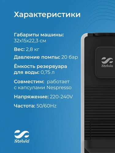 Кофемашина капсульная Stelvio NC300 W благодаря помпе с давлением 20 Бар обеспечивает насыщенный вкус и аромат напитков. Она поддерживает капсулы формата Nespresso Original. С помощью кофемашины можно готовить эспрессо, латте, капучино, ристретто, лунго, горячий шоколад. Автоматический капучинатор делает плотную молочную пенку и добавляет ее в чашку.