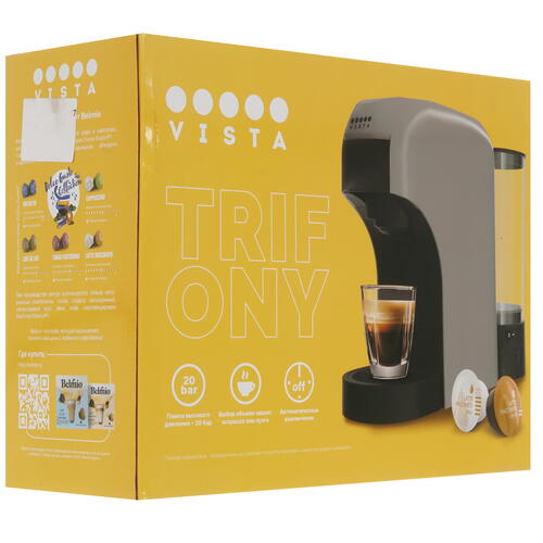 Vista Trifony Silver DNS300S использует для приготовления кофе капсулы Dolce Gusto. Кнопочная панель управления позволяет выбрать порцию напитка. Противокапельная система предупреждает проливание кофе мимо чашки. Параметры отображаются на встроенном дисплее. Конструкцией предусмотрен поддон для влаги.