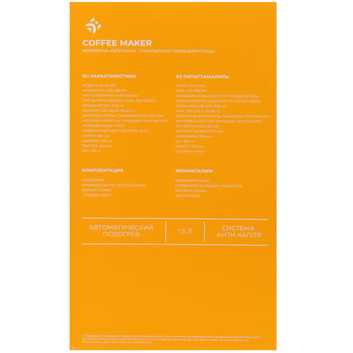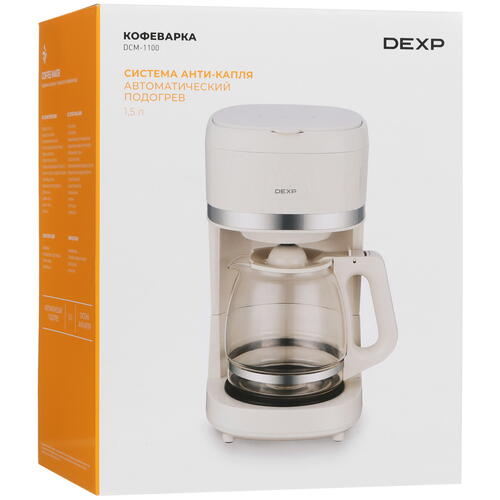 DEXP DCM-1100 идет в комплекте с 80 бумажными фильтрами и мерной ложкой. Длины кабеля 90 см хватает для подключения устройства к розетке недалеко от кухонного стола. Модель дополнена плитой автоподогрева для поддержания температуры напитка. Противокапельная система сохраняет чистоту устройства и столешницы.