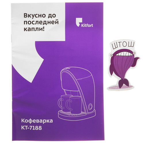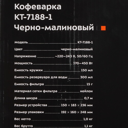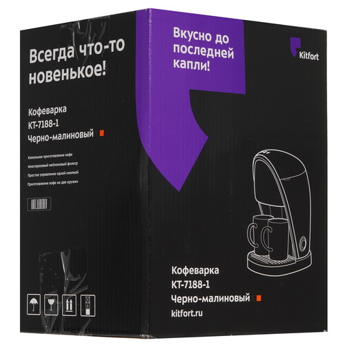 Kitfort КТ-7188-1 использует для приготовления кофе молотые зерна. Световой индикатор оповещает о готовности модели приступить к работе. За один раз прибор справляется с приготовлением 2 порций напитка. Кофе поступает в чашку объемом 0.15 л. Для подключения к сети предусмотрен 0.7-метровый кабель.