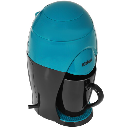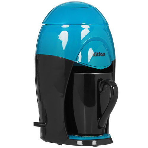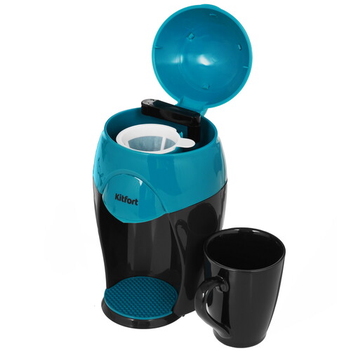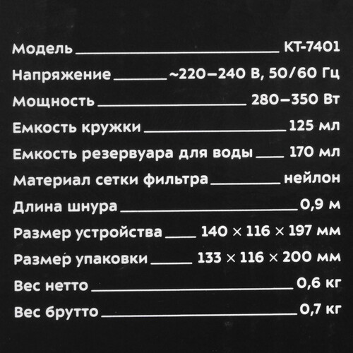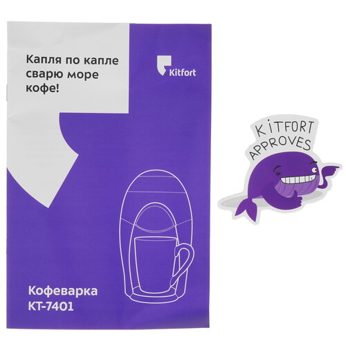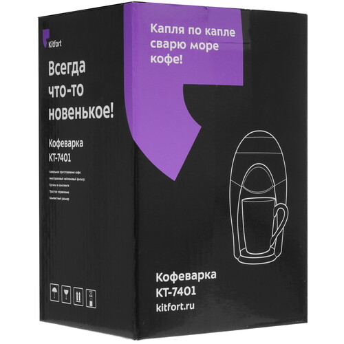 Kitfort КТ-7401 имеет световой индикатор, который оповещает о готовности приступить к работе. Сваренный кофе поступает в кружку объемом 125 мл. Подключение к сети производится через 0.9-метровый кабель. Объем резервуара для воды достигает 170 мл. Мерная ложка служит для наполнения фильтра молотым кофе.