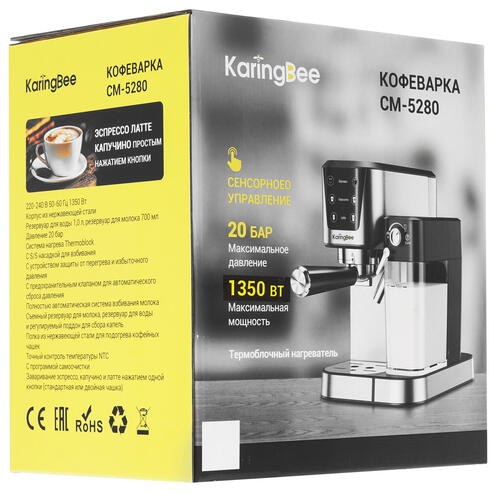 Кофеварка рожковая KaringBee CM5280 представлена в серебристом корпусе из металла и термостойкого пластика. Устройство подходит для приготовления напитка под давлением 20 Бар из молотого кофе. Модель дополнена автоматическим капучинатором с емкостью на 700 мл молока.