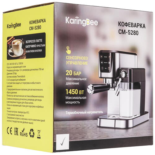 Кофеварка рожковая KaringBee CM5280 с автоматическим капучинатором позволяет готовить эспрессо, капучино, латте. Она оснащена сенсорной панелью управления с дисплеем. Благодаря струе воды с давлением 20 Бар и экстракции при постоянной температуре 92°С раскрывается вкус и аромат кофе.