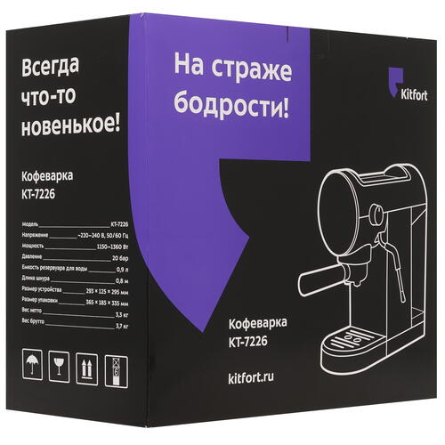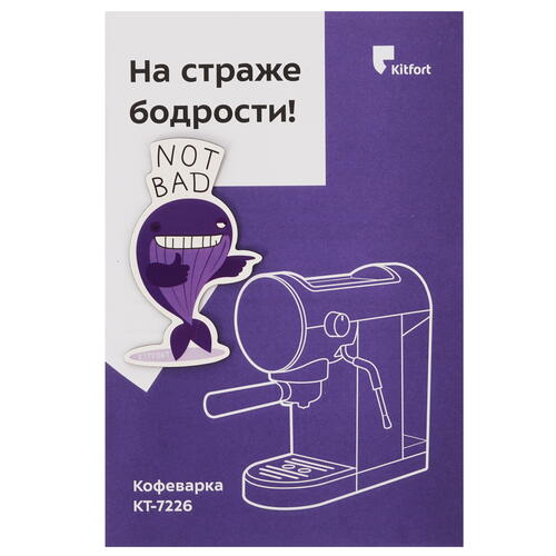 Кофеварка рожковая Kitfort КТ-7226 мощностью 1360 Вт обладает съемным поддоном, внутрь которого поступает влага. Выбор настроек осуществляется через сенсорную панель. Во время работы прибор использует молотые зерна.