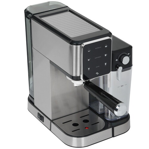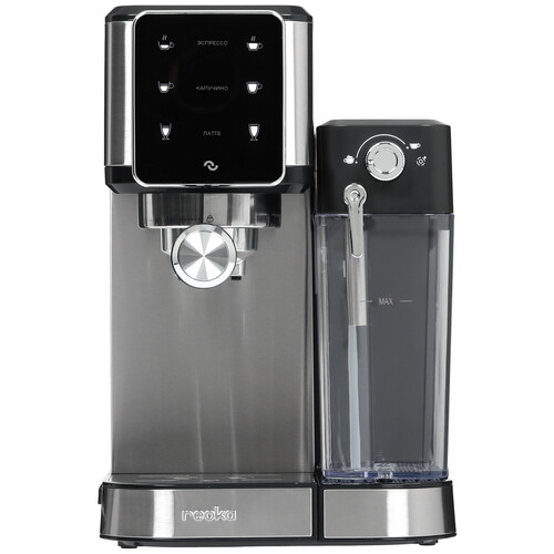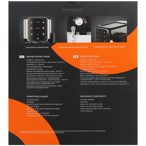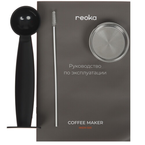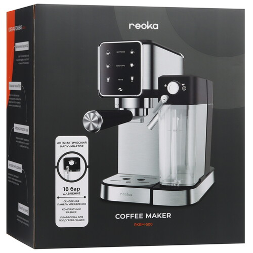 Reoka RKEM-500 дополнена системами защиты от избыточного давления, перегрева и поражения током. Сенсорные кнопки позволяют выбрать нужные функции и рецепт напитка. Модель идет в комплекте с двумя фильтрами и ложкой-темпером для точного отмеривания порции. Поддон для капель сохраняет чистоту на кухонном столе. Дизайн позволяет подставлять под кран для подачи напитка кружку высотой до 14 см. Длины кабеля 82 см хватает для подключения к розетке рядом с кухонным столом.